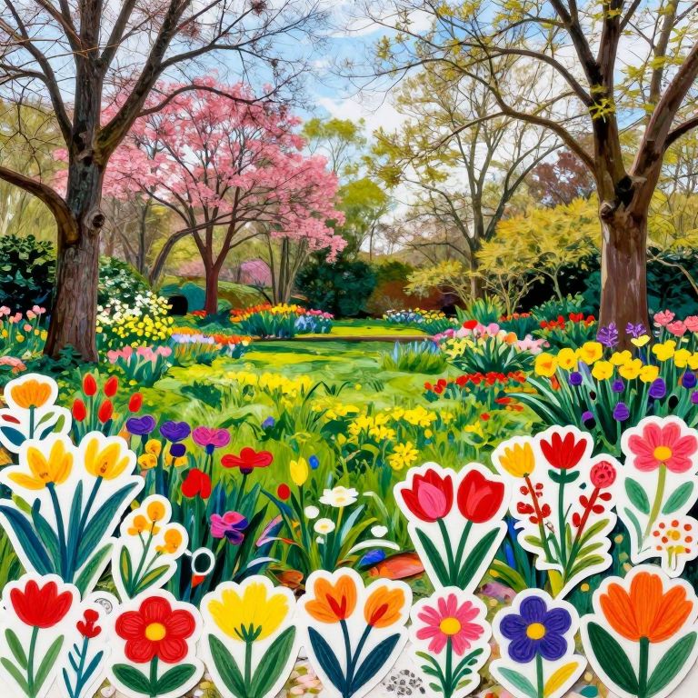 Bulk Stickers mixed media beautiful flowers in the garden and spring trees, art by Robert Rauschenberg,vibrant colors, wide angle, lit from behind,