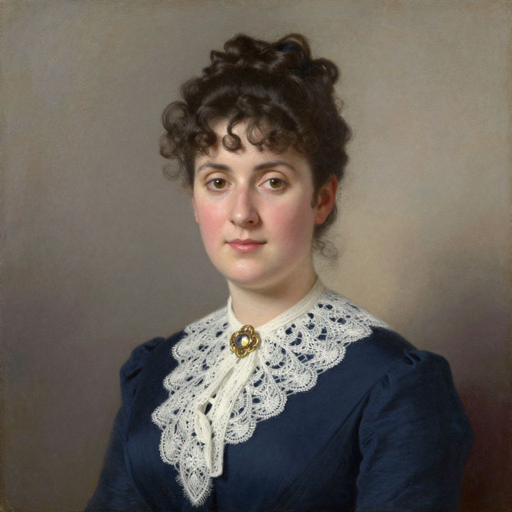 Photograph-style painting of a fair-skinned woman with curly dark hair, wearing a navy blue dress with intricate white lace collar, gold brooch,