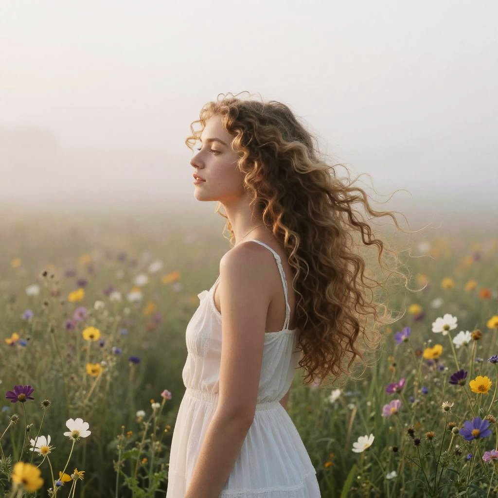 Blonde girl pretty standing in a sunlit meadow, golden hair flowing gently in the breeze, wearing a soft pastel dress, surrounded by blooming wildflowers and a serene blue sky, capturing a natural and ethereal beauty with warm, vibrant colors.