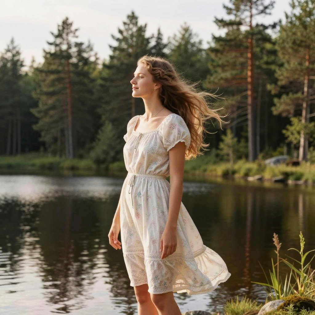 Photograph of a blonde woman with fair skin and closed eyes, standing in a sunny meadow filled with colorful wildflowers, including yellow, white, and purple blossoms. She wears a light, floral-patterned, short-sleeved dress with a v-neck and a cinched waist, the fabric gently billowing in the breeze. The background features a clear blue sky and a green field extending to the horizon. Sunlight casts a warm glow on her face and dress, highlighting the soft textures and delicate fabric of her clothing. Her relaxed, serene expression and gentle movement convey a sense of peacefulness and connection with nature.