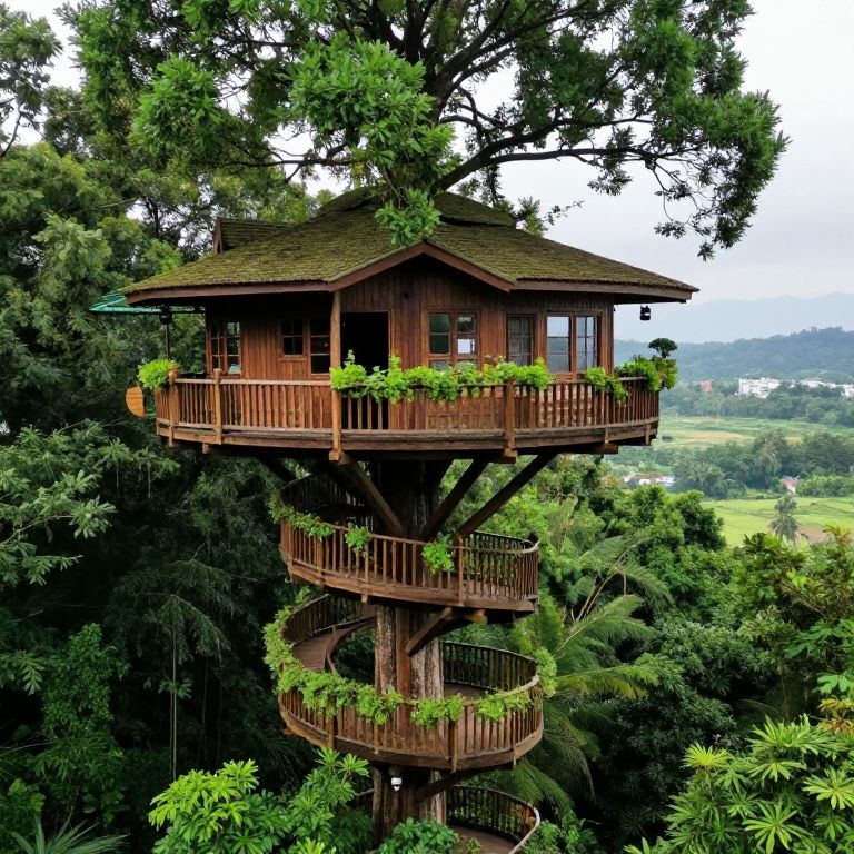 Spiraling wooden balconies, adorned with lush greenery, encircle a towering treehouse perched gracefully among dense forest canopies, blending seamlessly with the natural environment while offering panoramic views of the serene landscape below.