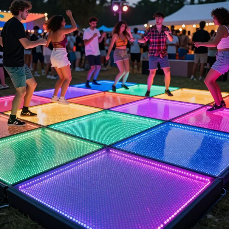 Photograph of a vibrant outdoor dance party at night. Young adults, both men and women, dance on large, colorful LED square panels that illuminate the floor with neon hues like blue, green, pink, and purple. The dancers are casually dressed in summer attire—shorts, t-shirts, and sneakers. In the background, a crowd stands and watches, with a white tent and string lights adding to the festive atmosphere. The scene is lively and energetic, with bright, glowing lights contrasting against the dark evening. The image captures the fun and excitement of the event.