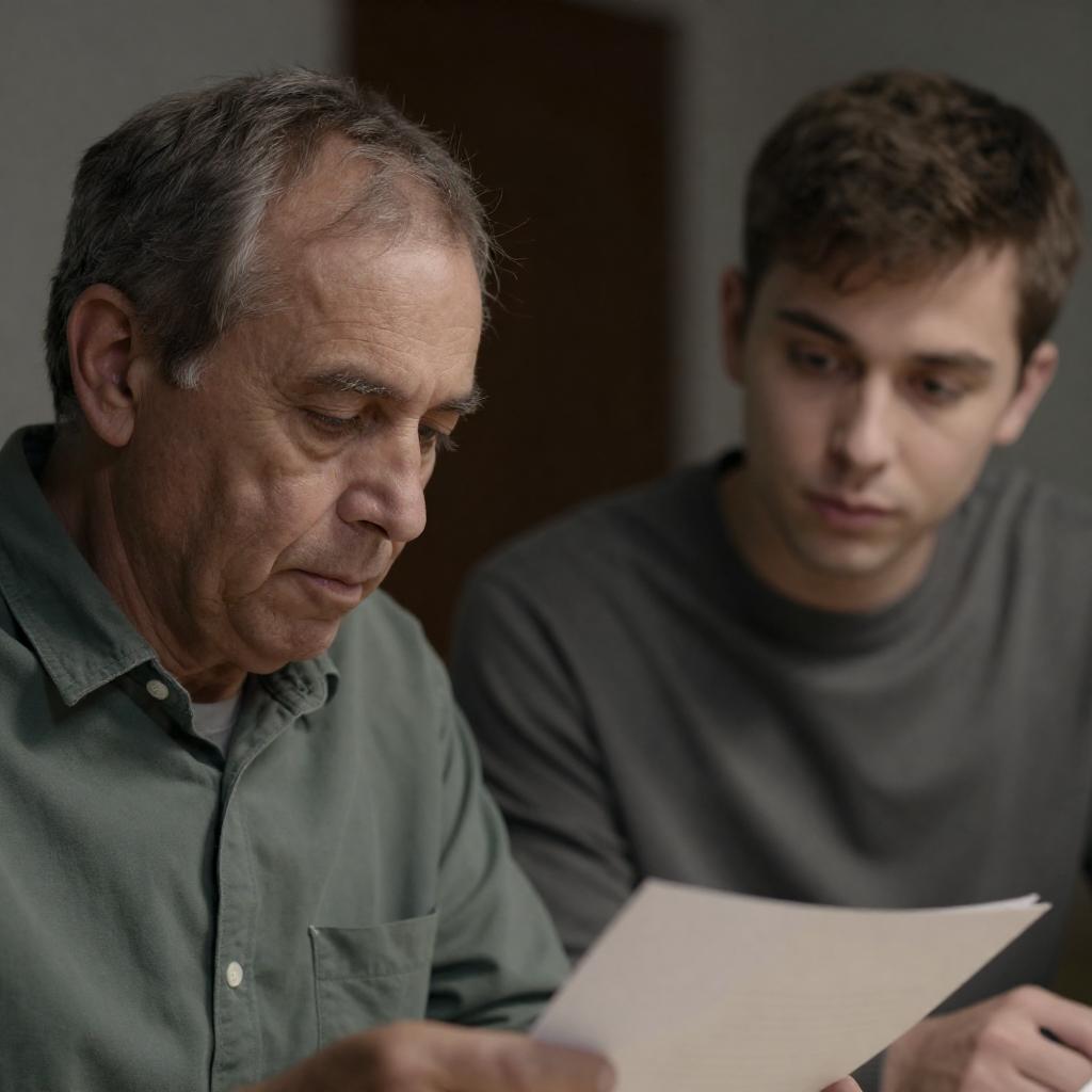 Photograph of two men in a cluttered kitchen. Large metal safe with dials on a wooden counter. Man on left with gray hair, dark jacket, focused expression. Man on right with brown hair, gray sweater, writing on paper, focused expression. Shelves, books, and kitchen appliances in background. Soft natural light from window.