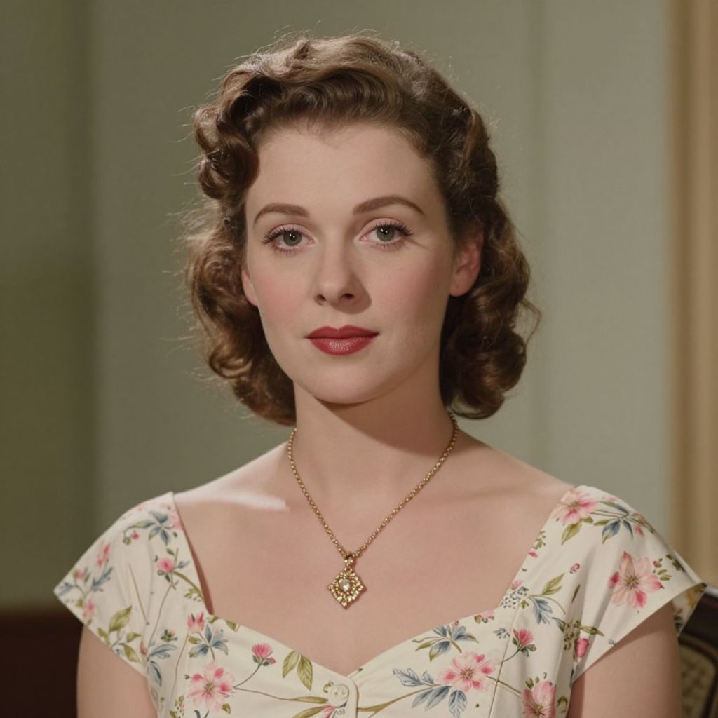 This photograph features a fair-skinned woman with short, wavy brown hair styled in vintage curls. She has blue eyes, light pink lipstick, and subtle makeup. She wears a cream-colored dress with a floral pattern in pink and green, and a gold necklace with a heart-shaped pendant. The background is softly blurred, with muted green and beige tones, suggesting an indoor setting. The overall style is reminiscent of mid-20th century fashion. The woman's calm expression and classic attire evoke a sense of elegance and timeless beauty.