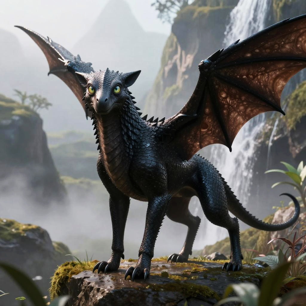 Uploaded on e621, ((by Scavy, by Nicola Samori, by Zack Snyder, by Ferdinand Knab)), solo (quadruped feral:1.35) ((toothless)) with ((black body)) and (black claws) and ((membranous wings)) and (clear yellow green eyes), (looking at viewer), ((three-quarter portrait)), ((all fours at mist mountain with plant and waterfall)), (fog), (detailed background, depth of field, half body shadow, sunlight, ambient light on the body), (masterpiece, best quality, ultra realistic, 4k, 2k, (intricate:0.9), (high detail:1.2), (3d \(artwork\):1.25), blender \(software\), soft focus, ray tracing, (unreal engine:1.25), absurd res)