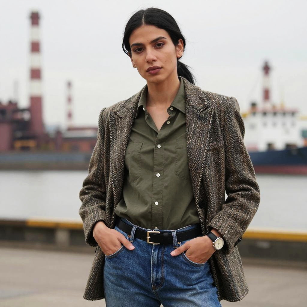 Masculine outfit females, female, solo, canvas, realistic, jeans, shirt, pants, belt, watch, wristwatch, blurry, open clothes, blurry background, hands in pockets, brown hair, beach, looking at viewer, photorealistic, ponytail, long hair, white shirt, casual, lips