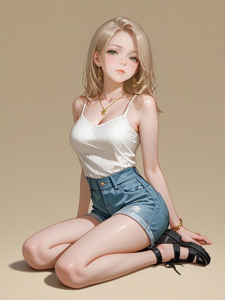 1girl, realistic face, full body shot, Woman, bohemian casual, sleeveless deep scoop neck tank top in a faded lilac hue, fringed high neckline, draped fit, paired with black denim shorts, high-waisted, frayed hem, gold layered statement necklace, wide-brimmed black floppy hat, white background.