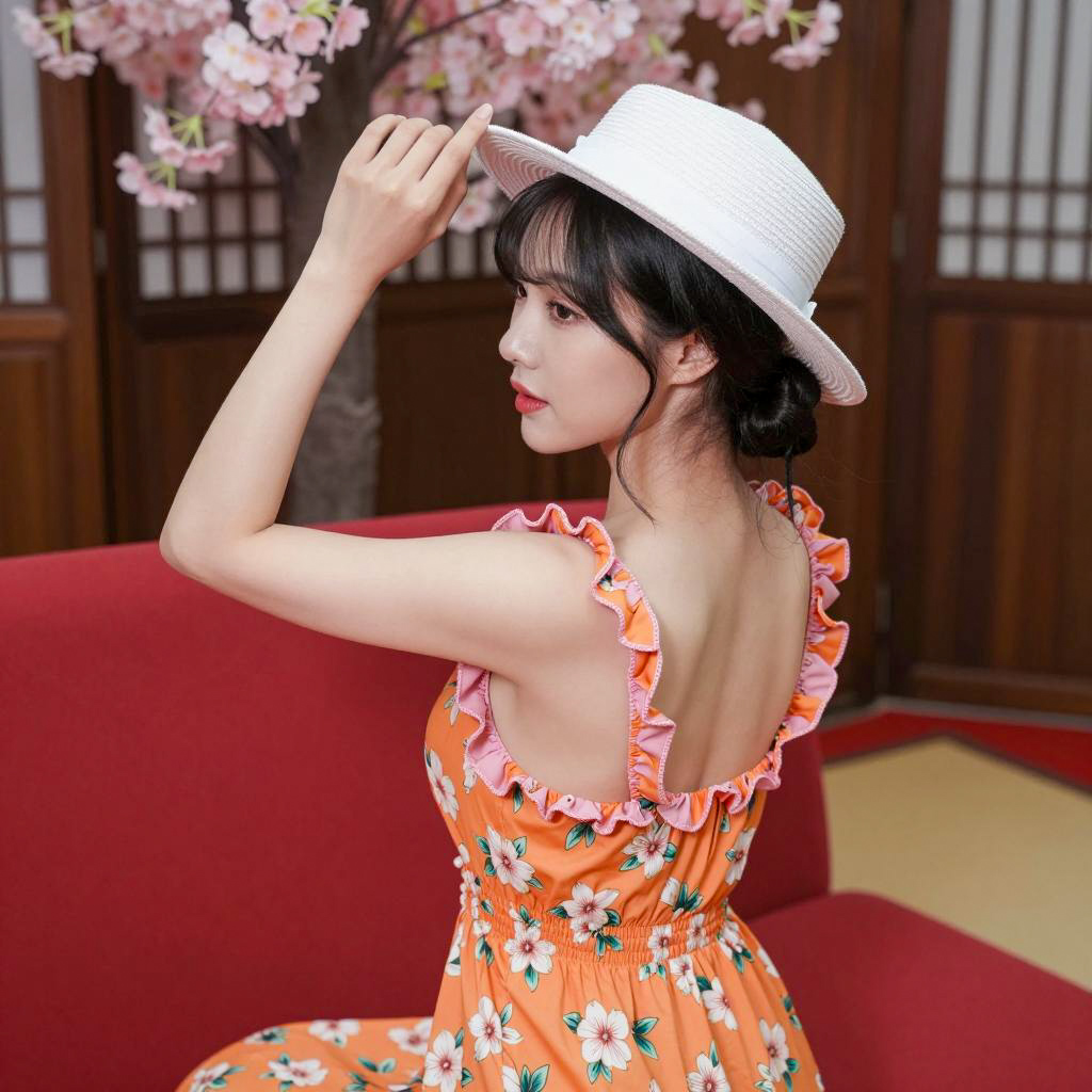 Portrait of an Asian woman with fair skin and black hair styled in a bun, wearing a white straw hat and an orange floral, backless dress with pink ruffles. She is sitting on a red couch indoors, looking over her shoulder with her right hand raised. The background features pink cherry blossom branches, dark wooden screens, a red carpet, and a beige mat.