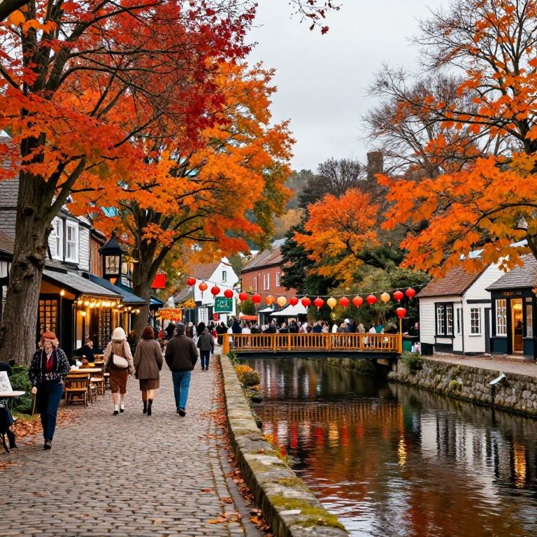 Photograph of a vibrant autumn street scene with cobblestone path, colorful orange-red leaves, red lanterns, people walking, and a reflective canal
