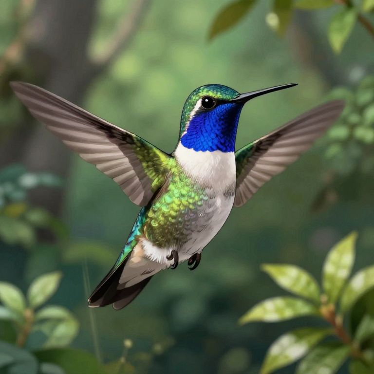 Photograph of a vibrant hummingbird mid-flight, set against a blurred green leafy background. The bird's iridescent feathers display a striking color palette: a vivid blue head, a white chest, a green back, and black-tipped wings. The hummingbird's long, slender beak is pointed forward, and its wings are blurred with motion, showcasing the rapid wingbeats typical of hummingbirds. The image captures the delicate textures of the feathers and the dynamic movement of the bird, with the green foliage providing a natural, serene backdrop.