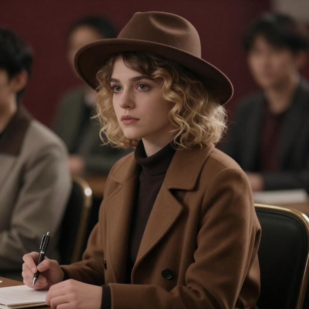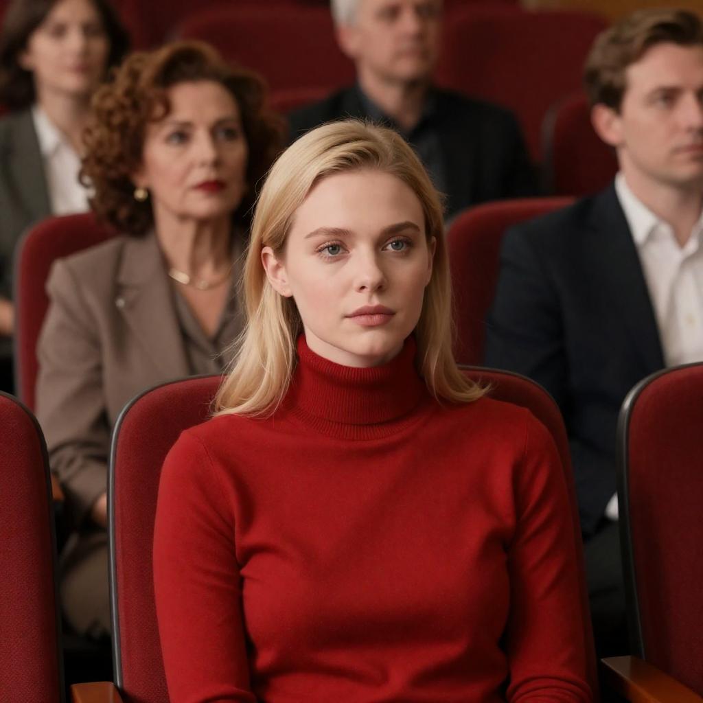 Photograph of a blonde woman with fair skin, wearing a red turtleneck, sitting in a red theater seat, looking forward with a neutral expression. Background includes an older woman with curly brown hair and red lipstick, and several other seated individuals, slightly out of focus. Red theater seats dominate the scene.