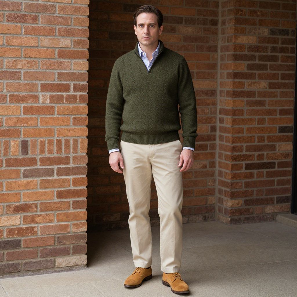 Photograph of a tall, handsome white man with short brown hair, wearing a dark green sweater, light blue shirt, beige pants, and brown shoes
