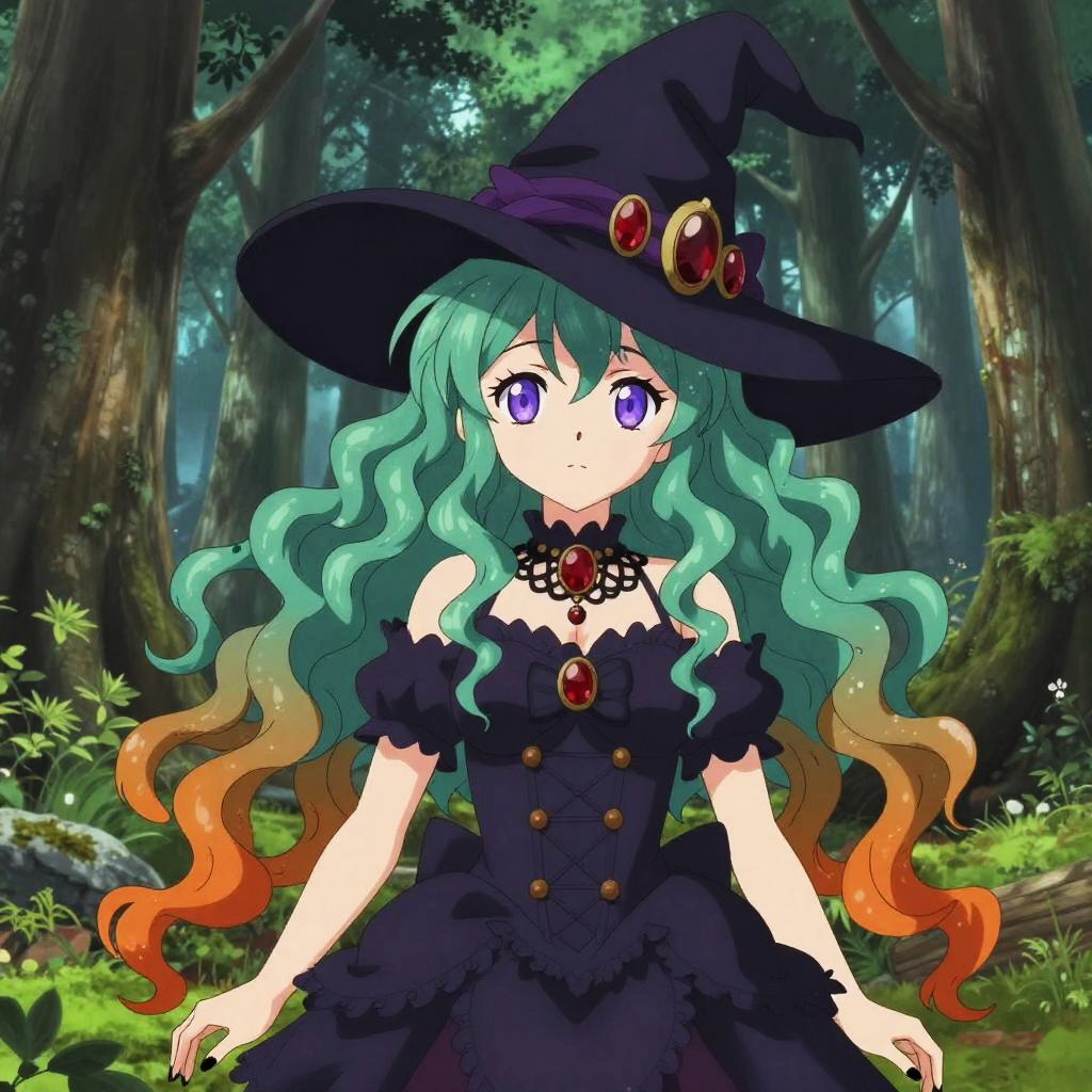 Anime-style drawing of a green-haired witch with gradient orange tips, purple eyes, wearing a black dress and hat, adorned with gems, in a lush
