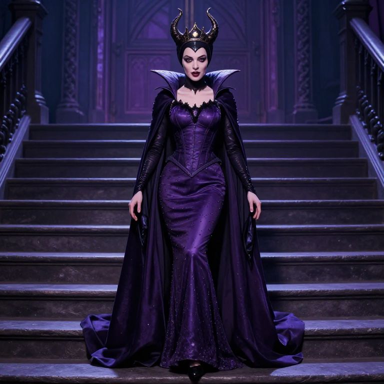 Photograph of a woman standing on grand, dark, illuminated stairs in a Gothic-style hall. She wears a black, form-fitting, long-sleeved gown with a corseted waist and a flowing, black cape. Her black crown features ornate, horn-like structures. She has pale skin, red lipstick, and dark, dramatic eye makeup. Her hands rest at her sides, and she gazes forward with a serious expression. The background includes dark, ornate walls and bannisters, adding to the Gothic ambiance. The overall color palette is dark with prominent blacks and purples, creating a mysterious, regal atmosphere.