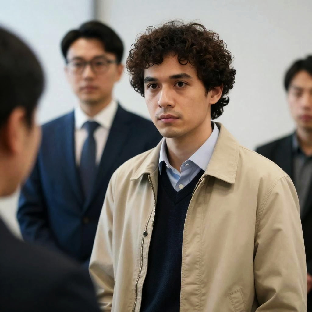 Portrait of an Asian man with messy brown hair, wearing a dark green suit jacket and light blue dress shirt, leaning forward intently at a desk. A DSLR camera with illuminated screen is visible in the foreground, with two blurred figures sitting around the desk. Background features beige paneled walls and a wooden chair, conveying a professional and concentrated atmosphere.