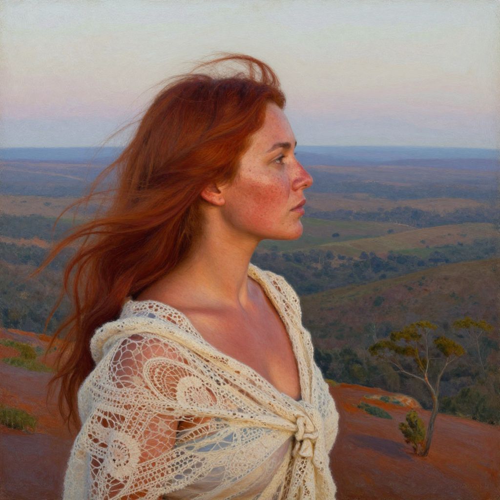 Create an impressionistic portrait of an Aboriginal woman with sun-kissed skin and flowing red hair. She is pictured on a hilltop, gazing pensively at the distant horizon. The bird's-eye view emphasizes her delicate features, including freckles scattered across her cheeks and the intricate patterns of her lace shawl. Soft, diffused light bathes her, highlighting the texture of her hair and skin. This panoramic image captures the introspective nature of the subject, while the vast landscape beyond evokes a sense of awe. The painting is characterized by impressionistic brushstrokes and vibrant colors, drawing viewers into a timeless artistic experience that ranges from contemplation to wonder.