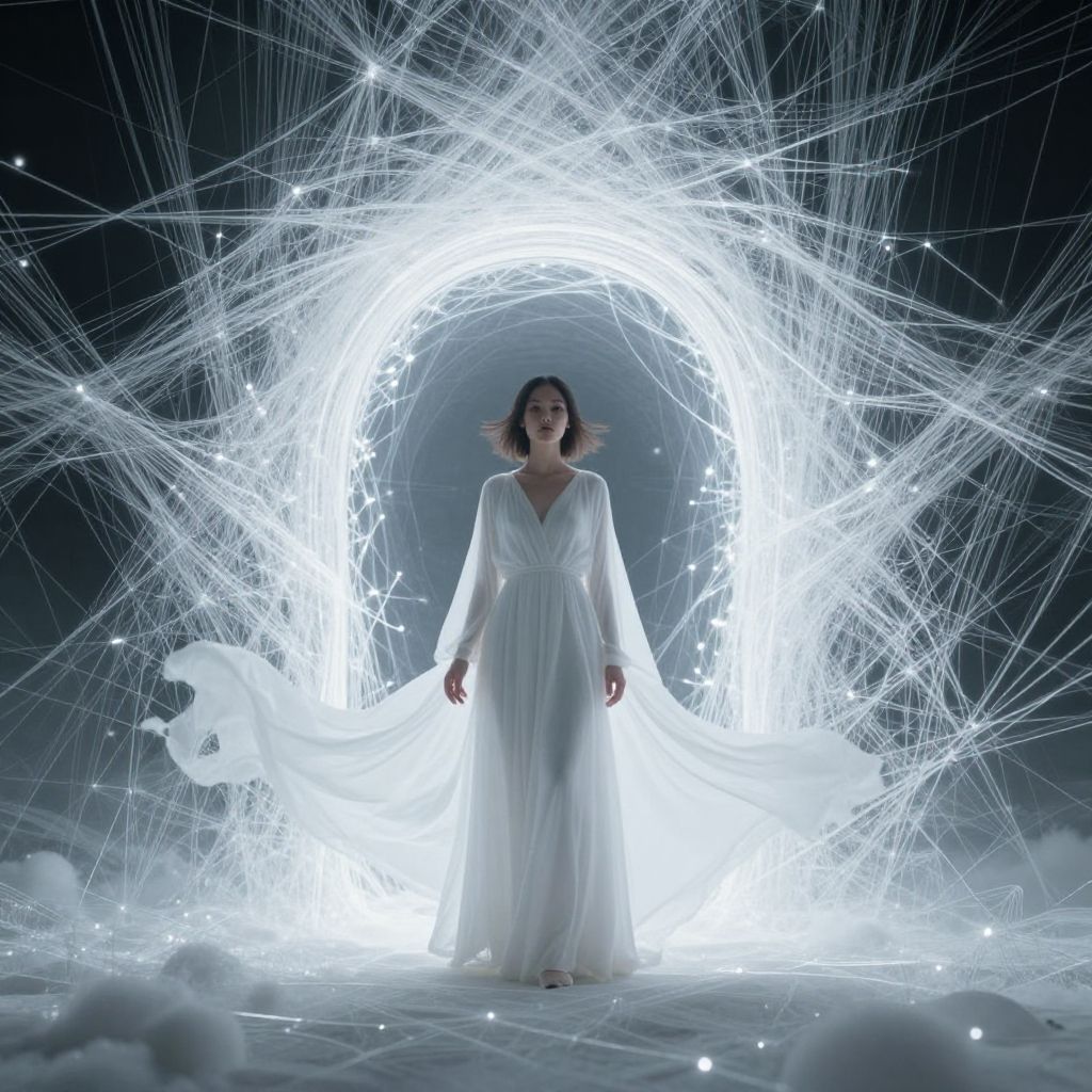 A woman in a flowing white gown stands before a radiant, ethereal portal composed of intricate, luminous threads, evoking a surreal, otherworldly atmosphere through its digital artistry and dramatic lighting effects.