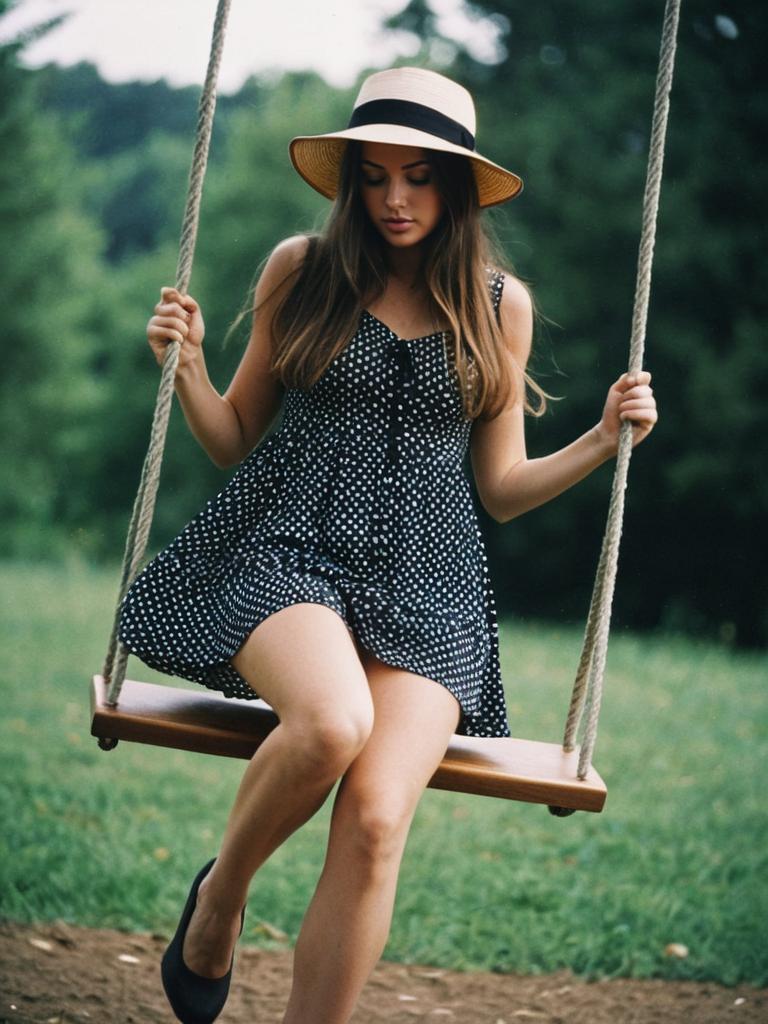 Woman swinging sweetie, 1girl, hat, dress, brown hair, no panties, outdoors, solo, underwear, blurry, thigh gap, long hair, solo focus