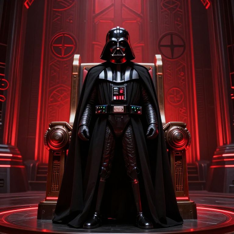 Darth Vader standing in a grand throne room, surrounded by Sith symbols and ancient technology, black cape flowing, vibrant red lighting casting dramatic shadows, epic fantasy sci-fi blend with detailed textures
