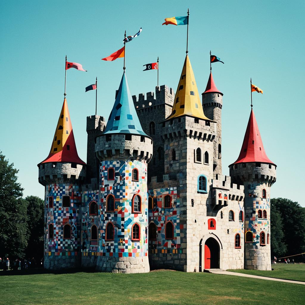 A whimsical folk art depiction of a historic medieval castle with playful pop-art colors. Features turrets and battlements, stylized flags in a style inspired by colorful graphic patterns and minimalistic shapes.