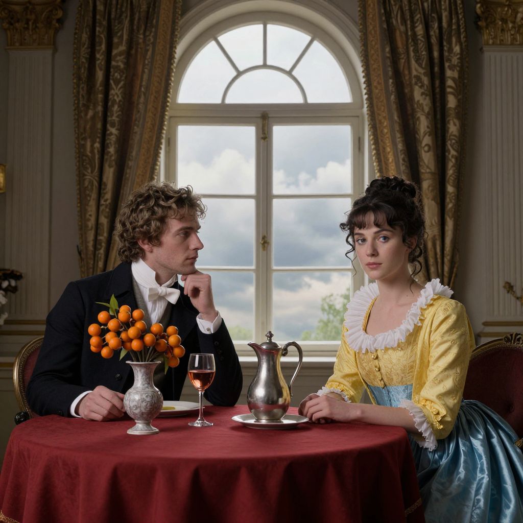 The image depicts a detailed, elegant scene reminiscent of the Bridgerton novel and TV series, stylized in the manner of Walter M. Baumhofer. Two figures, a man and a woman, are seated at a table adorned with a red tablecloth, set with a vase of orange berries, a glass of wine, and a silver pitcher. The man, dressed in a dark suit with a white shirt and bow tie, gazes contemplatively out the window, while the woman, in a yellow dress with a white ruffled collar and blue skirt, looks directly at the viewer. The background features an arched window with a view of a cloudy sky, framed by ornate columns and draped curtains. The overall composition is rich with texture, from the smooth fabrics to the intricate details of the window and curtains, creating a sense of depth and realism. The interplay of warm and cool colors, along with the careful arrangement of objects, contributes to the sophisticated and period-specific atmosphere of the scene.