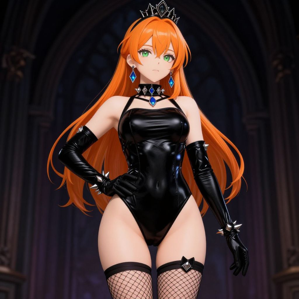 This digital anime-style illustration features a young woman with long, vibrant red braided hair, wearing a black and white Victorian-style maid outfit. She has large, expressive blue eyes and a fair complexion. The dress has a tight corset, white ruffled sleeves, and a full skirt adorned with lace. A black ribbon choker with a bow sits around her neck, and she wears a matching black maid hat with a white ribbon and star emblem. The background is an elegant, blurred indoor setting with ornate, classical architecture and warm lighting. The overall style is detailed and polished, with a focus on her striking appearance and elaborate costume.