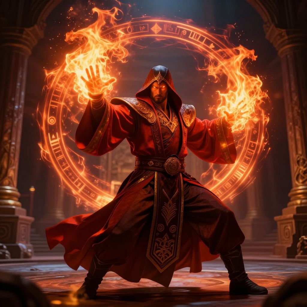 Two magicians clad in ornate robes and pointed hats engage in a mystical duel, casting vibrant blue and red energy spells that ripple through the air, creating dynamic visual effects against a backdrop of golden-hour lighting and ancient stone architecture, rendered in a high-definition digital art style.