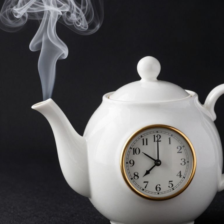 Steam gracefully curls upward from a pristine white teapot, its spout emitting wisps that intertwine with the scene, while a gold-rimmed clock face embedded in the teapot's body displays the time, blending functionality with artistic whimsy against a dark backdrop.