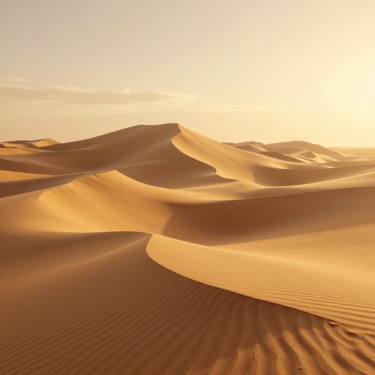 Photograph of golden-orange sand dunes at sunset, with rippled textures and soft shadows, under a bright, clear sky.