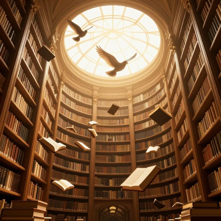 Photograph of a grand, circular library with towering wooden bookshelves filled with books, illuminated by a bright, circular skylight at the center. Three birds with outstretched wings are mid-flight, and several open books are floating in the air. The warm, golden light from the skylight casts dramatic shadows, enhancing the sense of depth and grandeur. The ceiling is adorned with ornate details, and the library's architecture features arches and columns. The overall atmosphere is mystical and scholarly, with a blend of natural and artificial light creating a magical, ethereal feel.