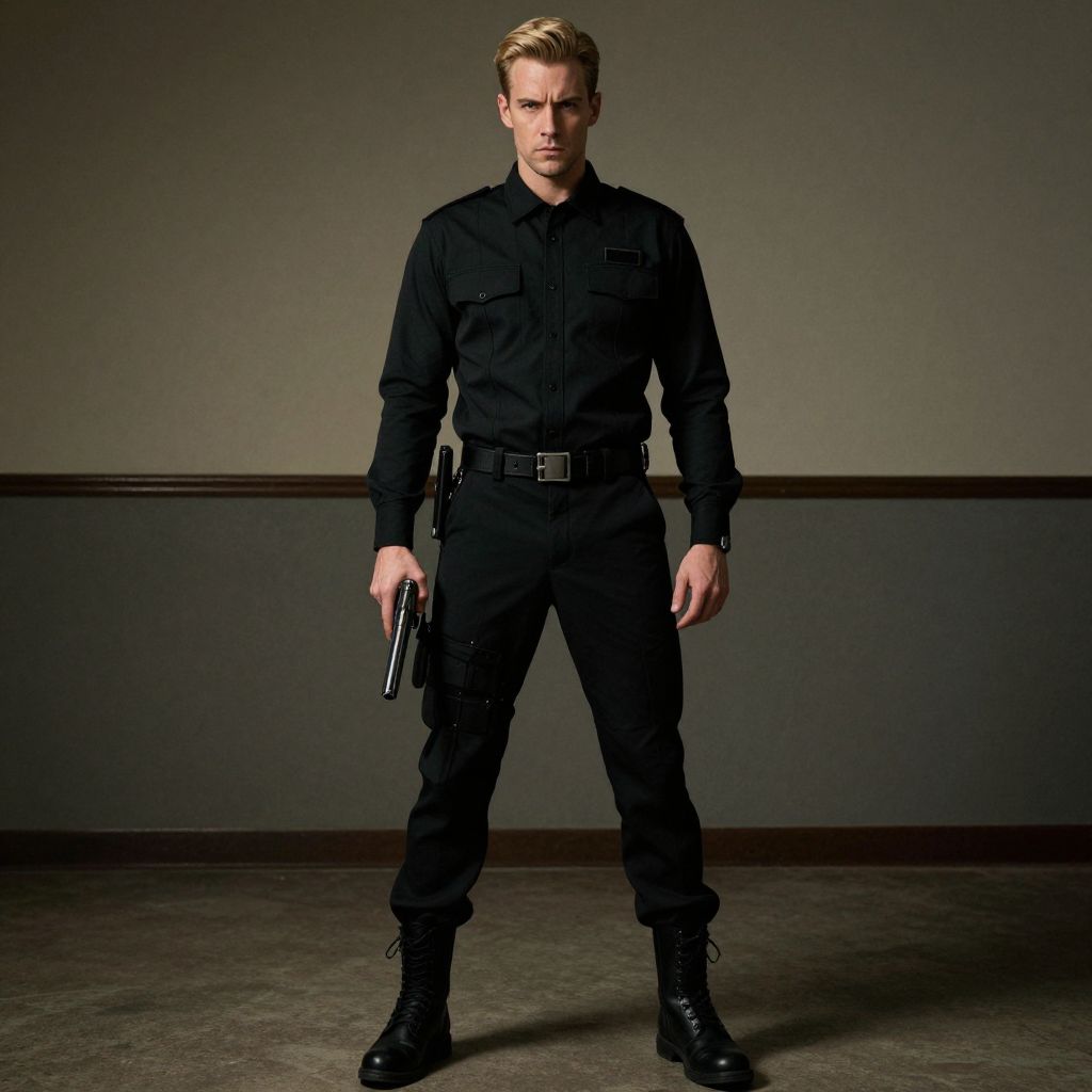 A man with short, stylish blonde hair and a sharp, defined jawline stands confidently in a dimly lit room, wearing a sleek black uniform with a crisp black belt and polished black boots. He holds a sleek, semi-automatic handgun in his right hand with a firm grip, his posture straight and tense. His eyes are locked forward with a serious, determined expression, conveying focus and alertness. The lighting is soft and shadowed, emphasizing his stern demeanor and the subtle details of the uniform and weapon. A faint sense of tension fills the atmosphere, suggesting a moment of high stakes or quiet vigilance.