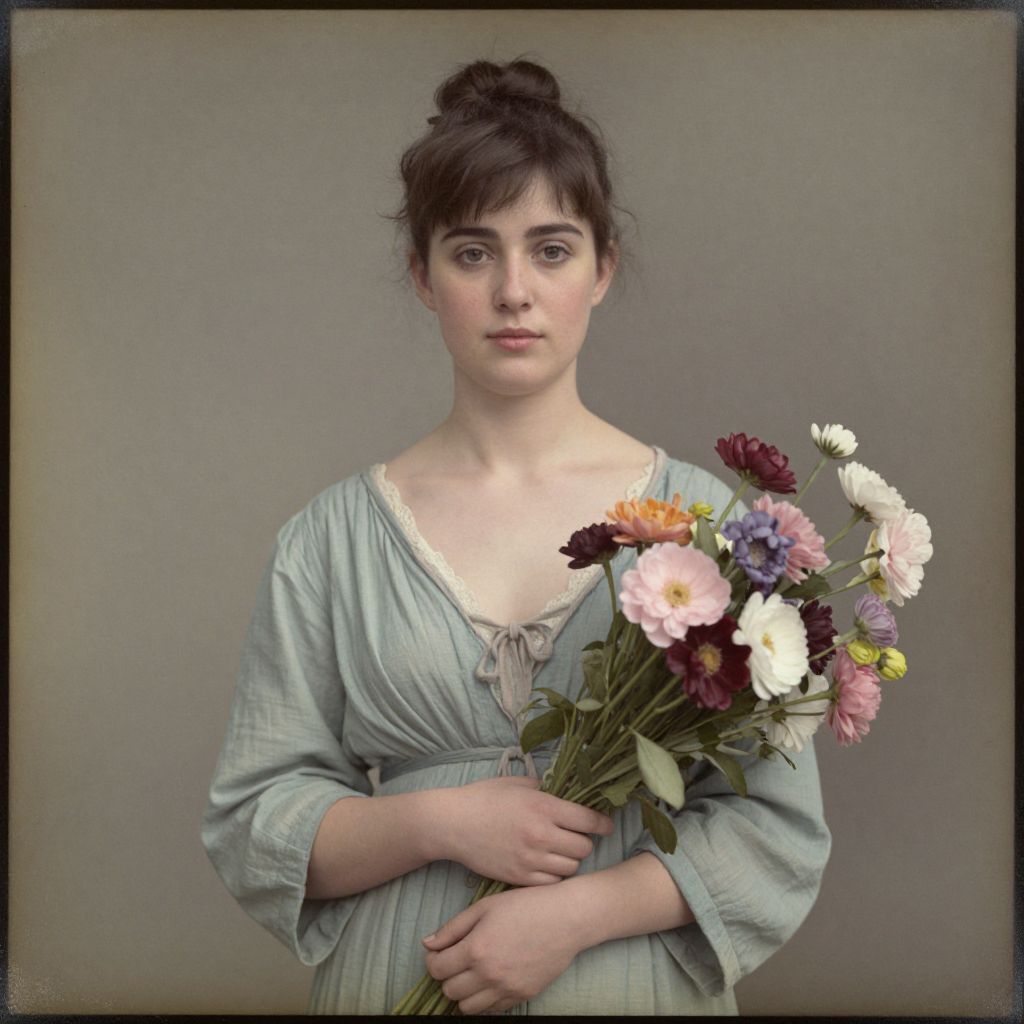 Portrait of a woman holding a bunch of flowers c.1898 (hand-tinted photo)