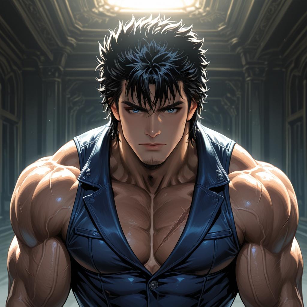 A digital illustration of a muscular anime man with black spiky hair, piercing blue eyes, and a chest scar, wearing a dark blue sleeveless vest. The character stands in a dimly lit, ornate corridor with intricate architectural details and a light source above, emphasizing his strong physique and determined expression. The artwork is inspired by the style of artist Andou Shuki and reminiscent of the character Kenshiro from Hokuto no Ken.