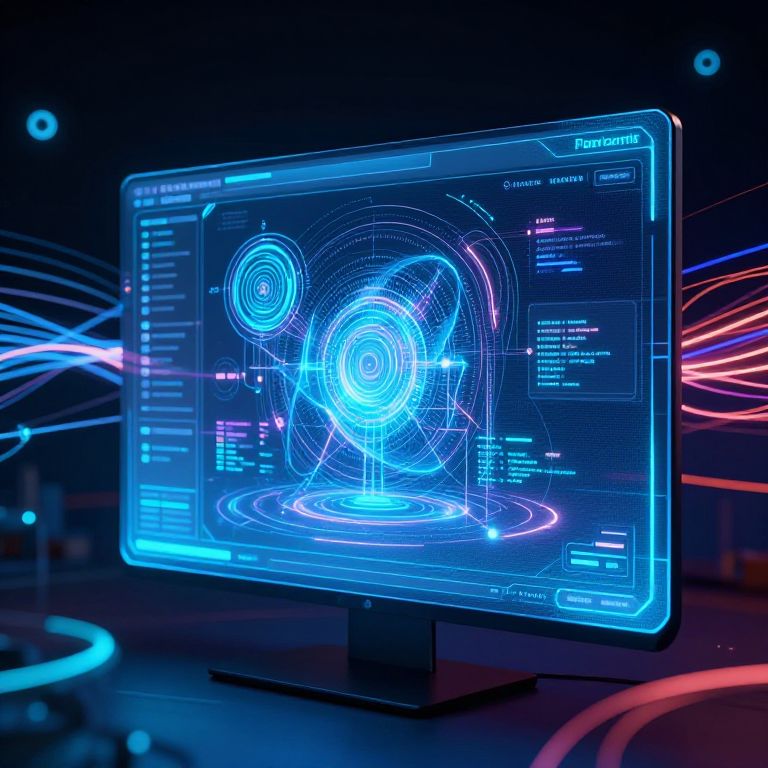 Photograph of a high-tech computer monitor displaying a vivid, neon blue and white holographic interface with intricate circular patterns and text. The screen, mounted on a sleek black stand, is set against a dark background with dynamic, colorful light trails in blue and red, creating a futuristic, cybernetic atmosphere. The monitor's screen is illuminated with bright, glowing lines and data, giving it a high-tech, sci-fi feel. The image emphasizes advanced technology and a digital, immersive environment.