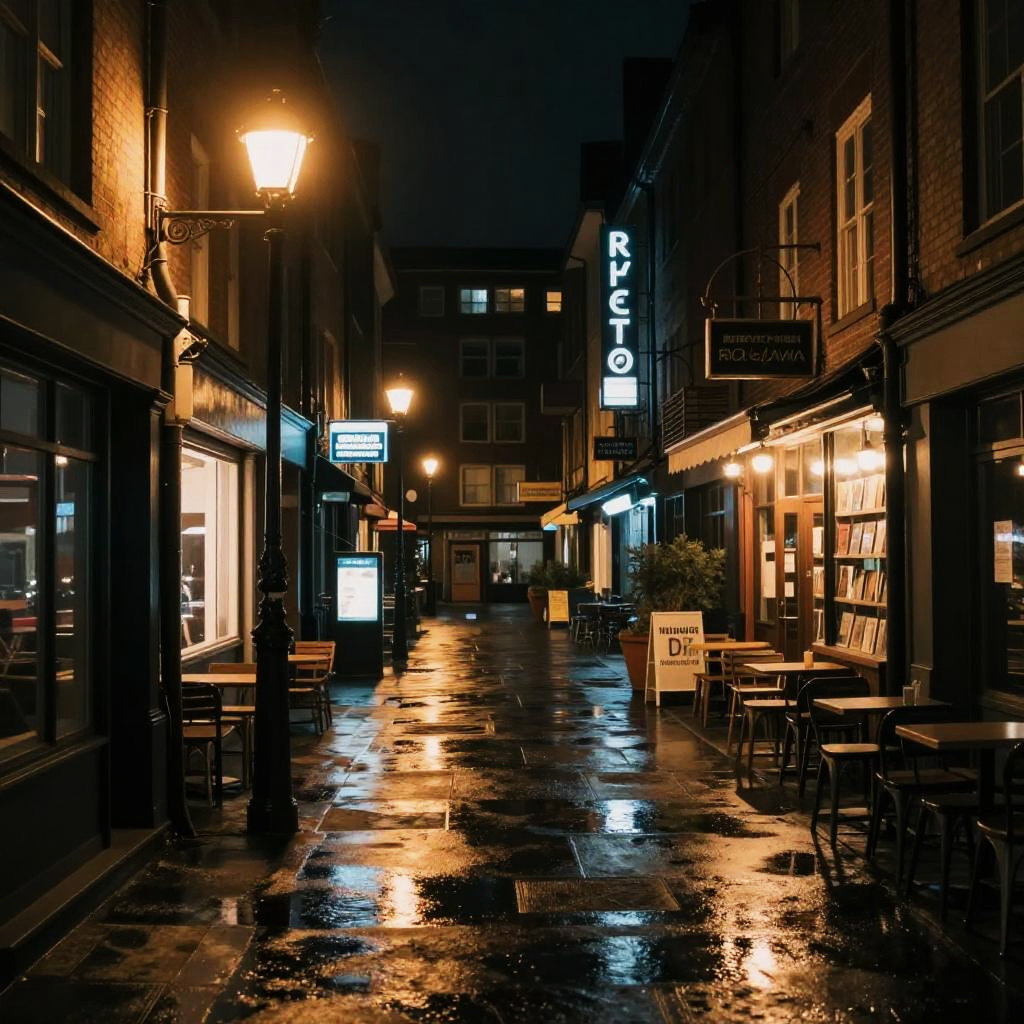 Nw1 nighttime city view with glowing street lamps and neon signs, reflections in puddles, quiet alleys lined with small cafes and bookstores, deep shadows contrasted by warm light, cinematic mood, high contrast and realistic textures