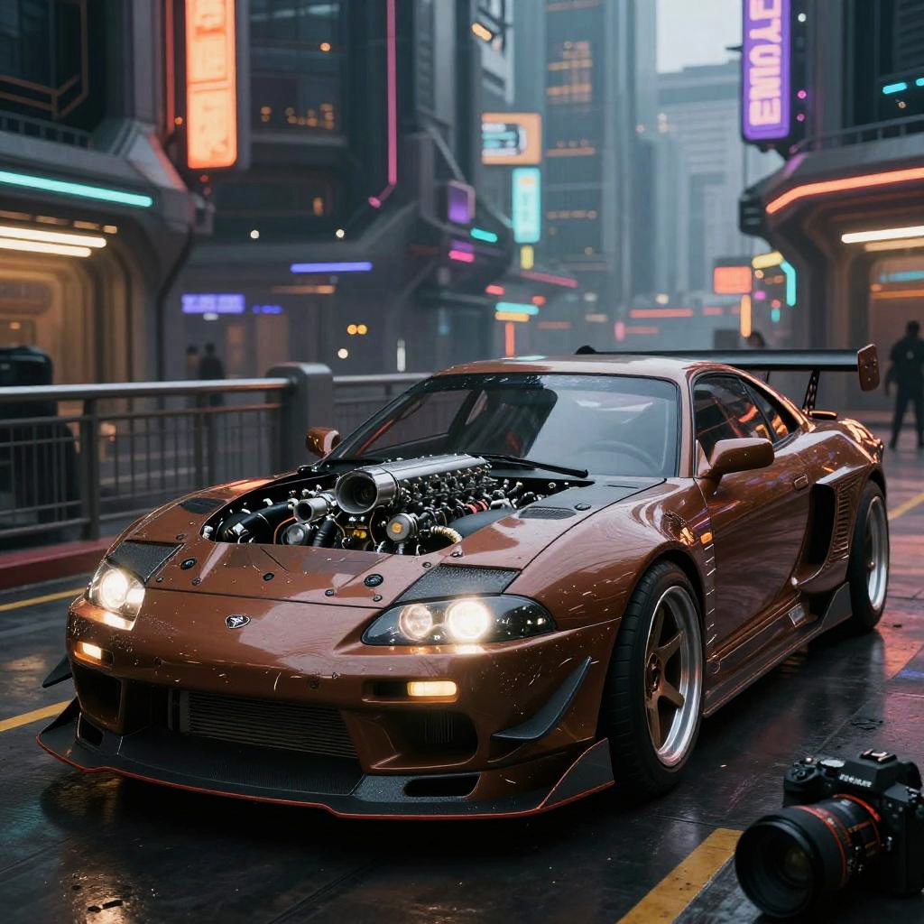 Professional photo of a futuristic tuner car with multiple modifications, brown painting, parked, cybernetic hood, cyber car parts, (exotic headlights), mad-max, v8 engine, blower, front pop up headlights, futuristic, car mods, spoiler, science fiction, sci-fi scenario, night, natural light, cyberpunk, futuristic city, cyberpunk city, neon signs, (highly detailed), (highly detailed background), multiple buildings in the background, detailed textures, wide angle, 8k, HDR, professional photoshoot, high quality photo, realistic photo, realistic shadows, detailed shadows, realistic proportions, photographed with a Sony a9 II Mirrorless Camera, film grain, raw photo, physically-based rendering, vibrant colors, award winning picture