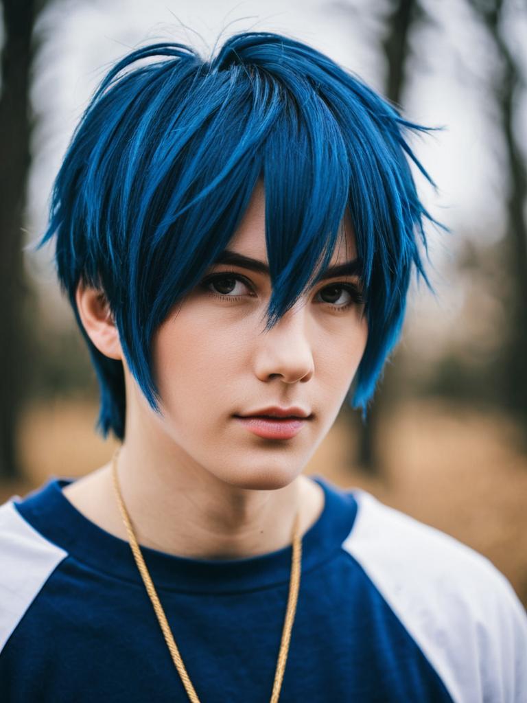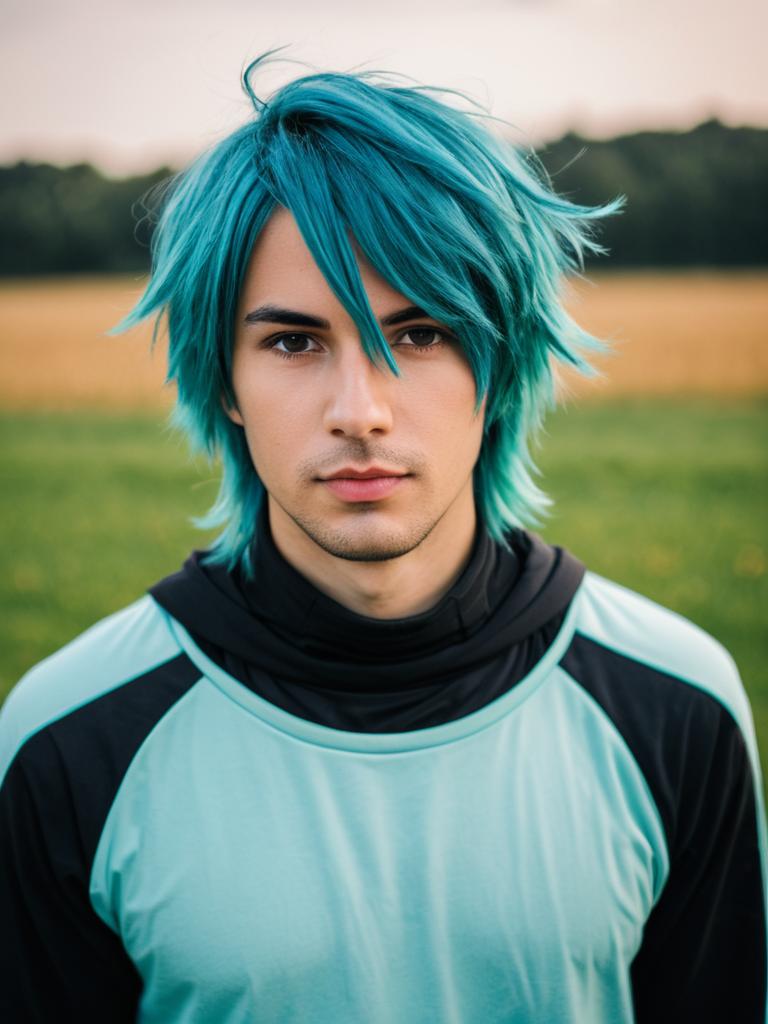 Photo-realistic cosplay photo of person in astel leda costume. 1boy, aqua eyes, hair between eyes, green eyes, blue hair, blonde hair, streaked hair, short hair, long sleeves, virtual youtuber, virtual youtuberlifestyle stock photo, shallow depth of field, lifestyle stock photography, shallow depth of field, natural lighting, warm tones, soft background blur, candid moments, vibrant colors, realistic textures, modern casual clothing. full body shot