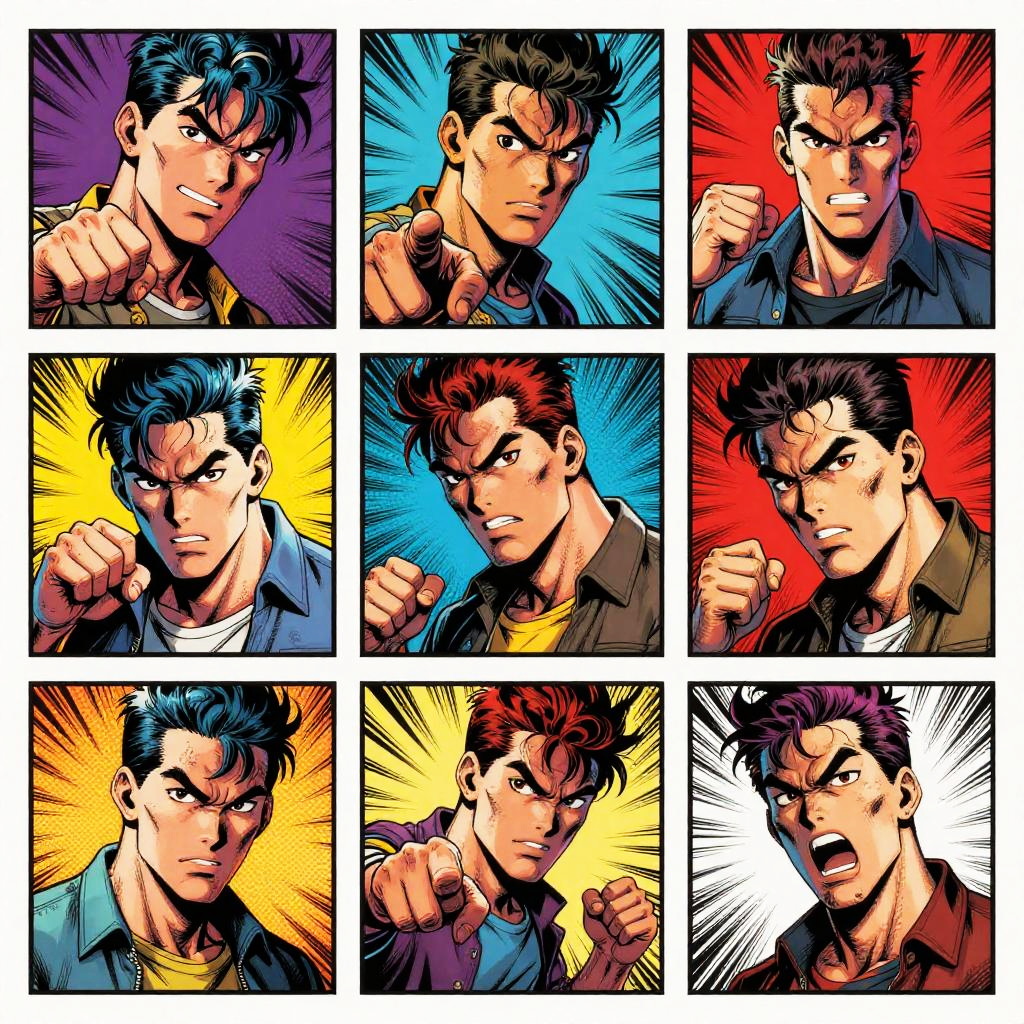 Turn photos into comic book art, vibrant colors and bold black outlines, dynamic shading and halftone patterns, exaggerated expressions and dramatic angles, high contrast with stylized textures, capturing action and emotion in every panel.