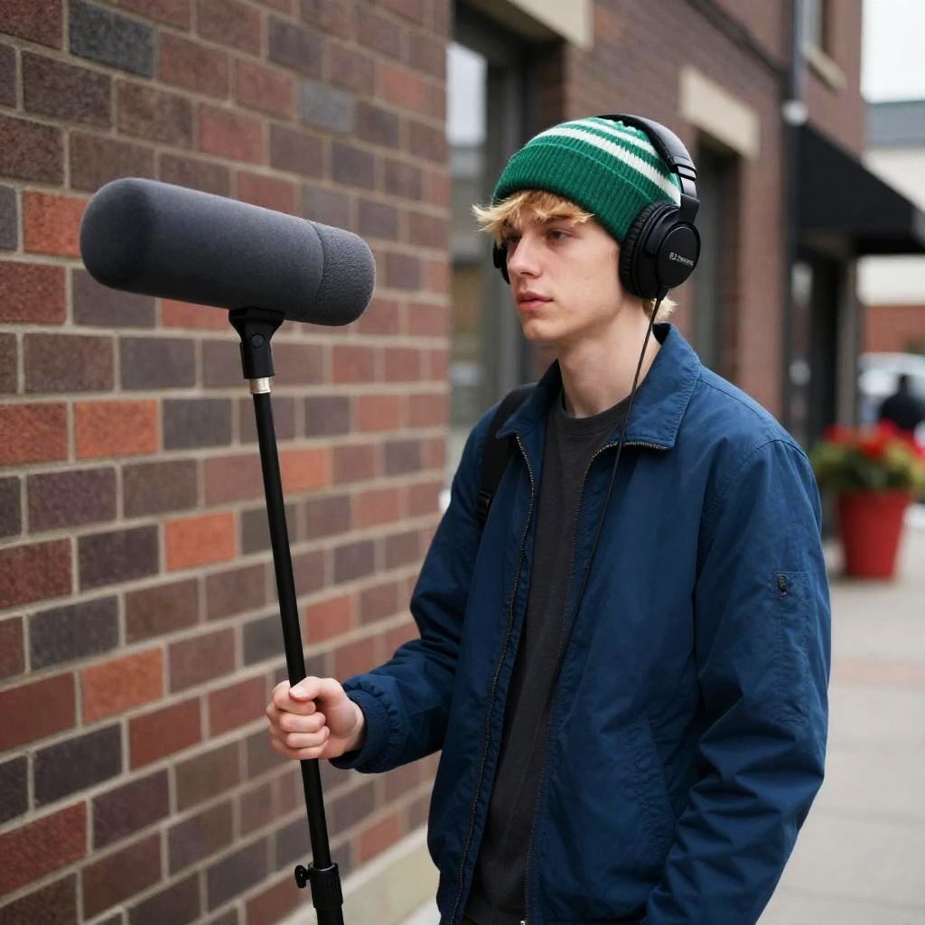 Young man with blonde hair, wearing green and white striped beanie, blue jacket, and headphones, using a large gray foam microphone on a brick wall. Standing on a sidewalk, holding microphone boom pole with right hand. Background includes brick buildings and red flower pots. Facial expression is focused.