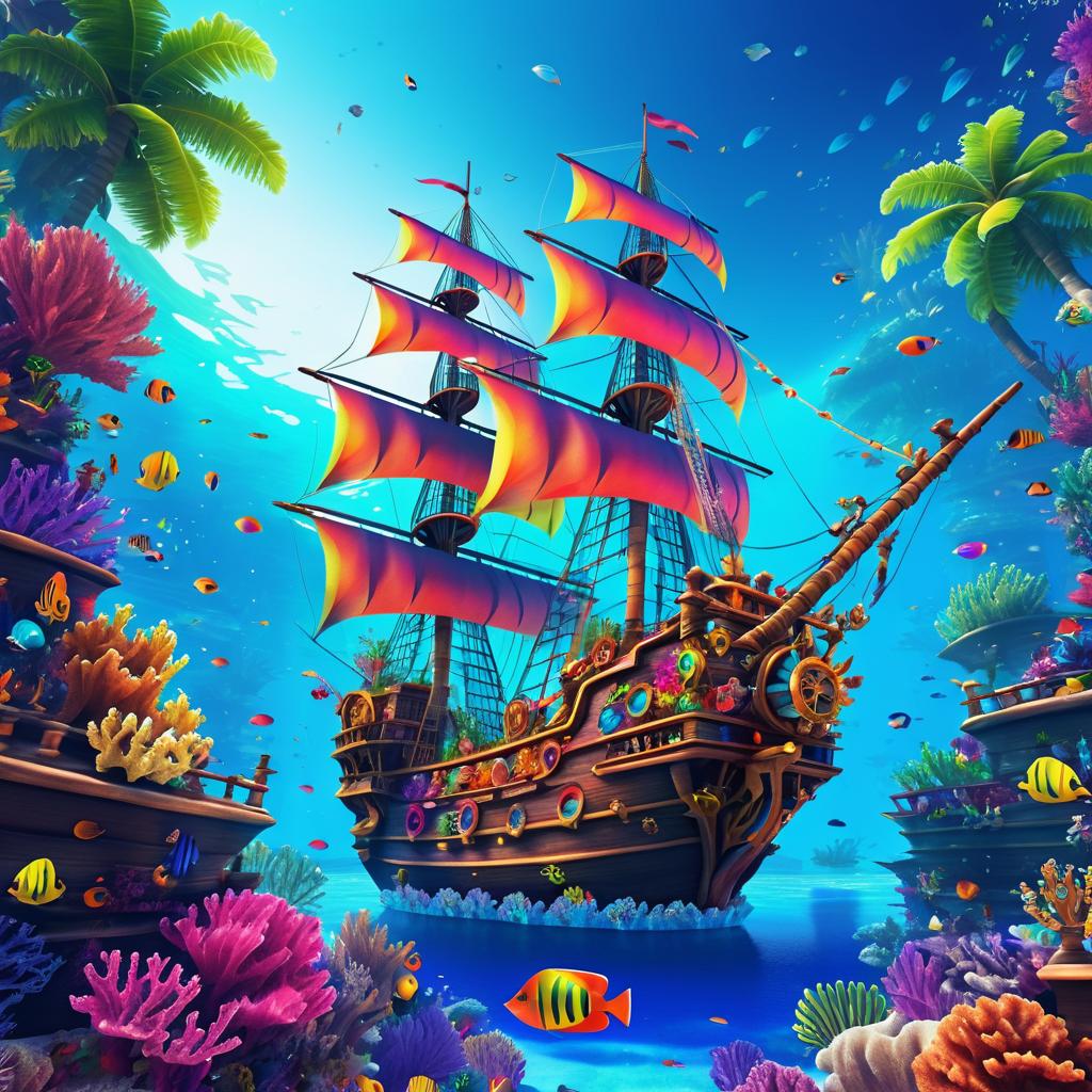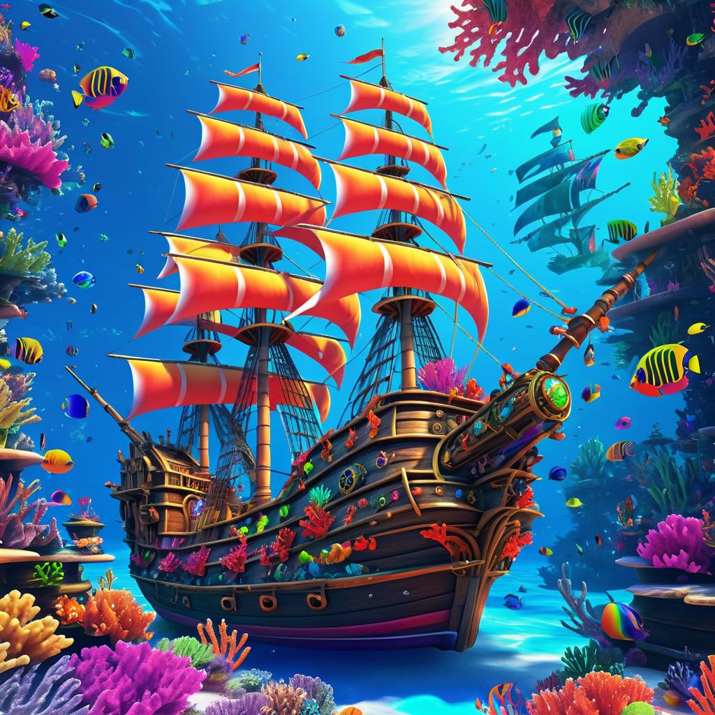 Pirate ship sailing through a vibrant coral reef with colorful fish swimming around. Ultra-detailed concept art, trending on ArtStation, HD quality.