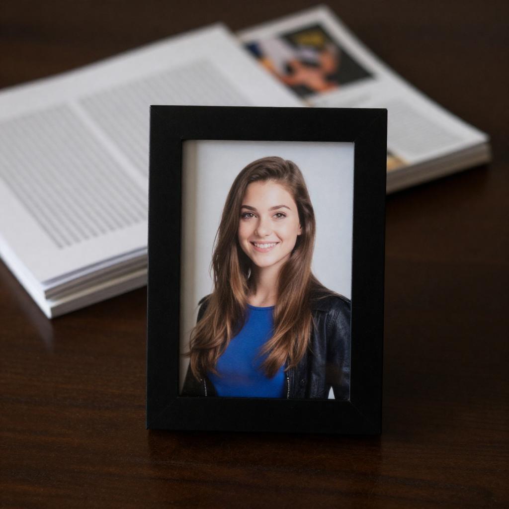 Photograph of a framed picture on a dark wooden table. Framed picture shows a young woman with long brown hair, blue top, and black jacket, smiling. Several stacked papers with and a partially visible magazine behind. Dark, dimly lit setting.