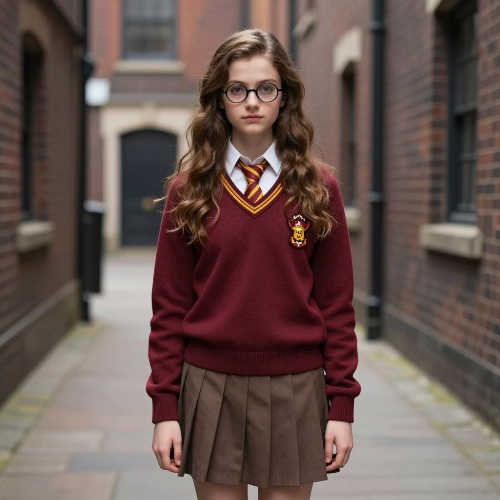Harry potter fancy dress, photorealistic, young woman, standing in a narrow alleyway, wearing a Hogwarts school uniform, maroon long-sleeve sweater with yellow and red trim, white shirt, striped tie, brown pleated skirt, glasses, long wavy brown hair, brick buildings in background, overcast lighting, realistic ures, digital art, T2I, Hogwarts aesthetic, detailed clothing, authentic schoolgirl look, serene expression, realistic shadows