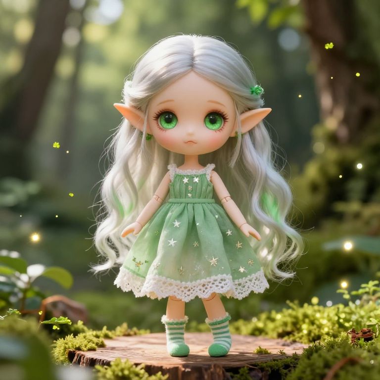 A delicate female elf doll with soft, porcelain-like skin and large, sparkling green eyes, wearing a flowing green dress with delicate lace trim and tiny embroidered stars, paired with matching green striped socks that add a playful touch. Her hair is long, silvery-white with subtle hints of green, styled in loose waves, and she stands on a mossy wooden platform in a sun-dappled forest clearing. The scene is whimsical and enchanted, with fairy lights and floating pollen particles in the air, creating a magical, dreamy atmosphere.