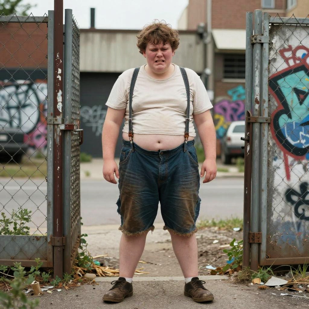 Ugly fat boy in a rundown urban neighborhood, surrounded by broken fences and graffiti walls, wearing mismatched clothes and scuffed shoes, expression of frustration and determination, gritty texture and muted tones