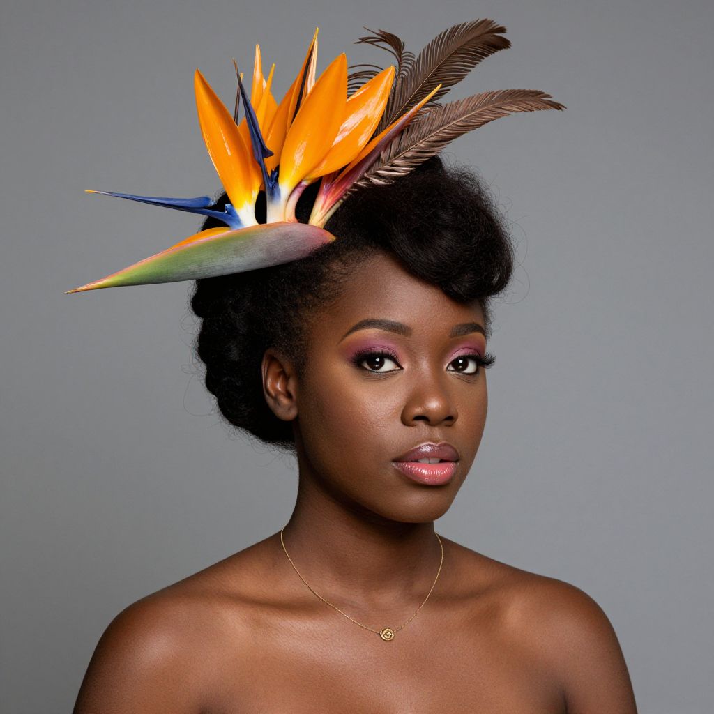 A beautiful black woman with vibrant bird of paradise flowers and feathers in her hair, wearing a gold necklace, in a portrait photography setting.