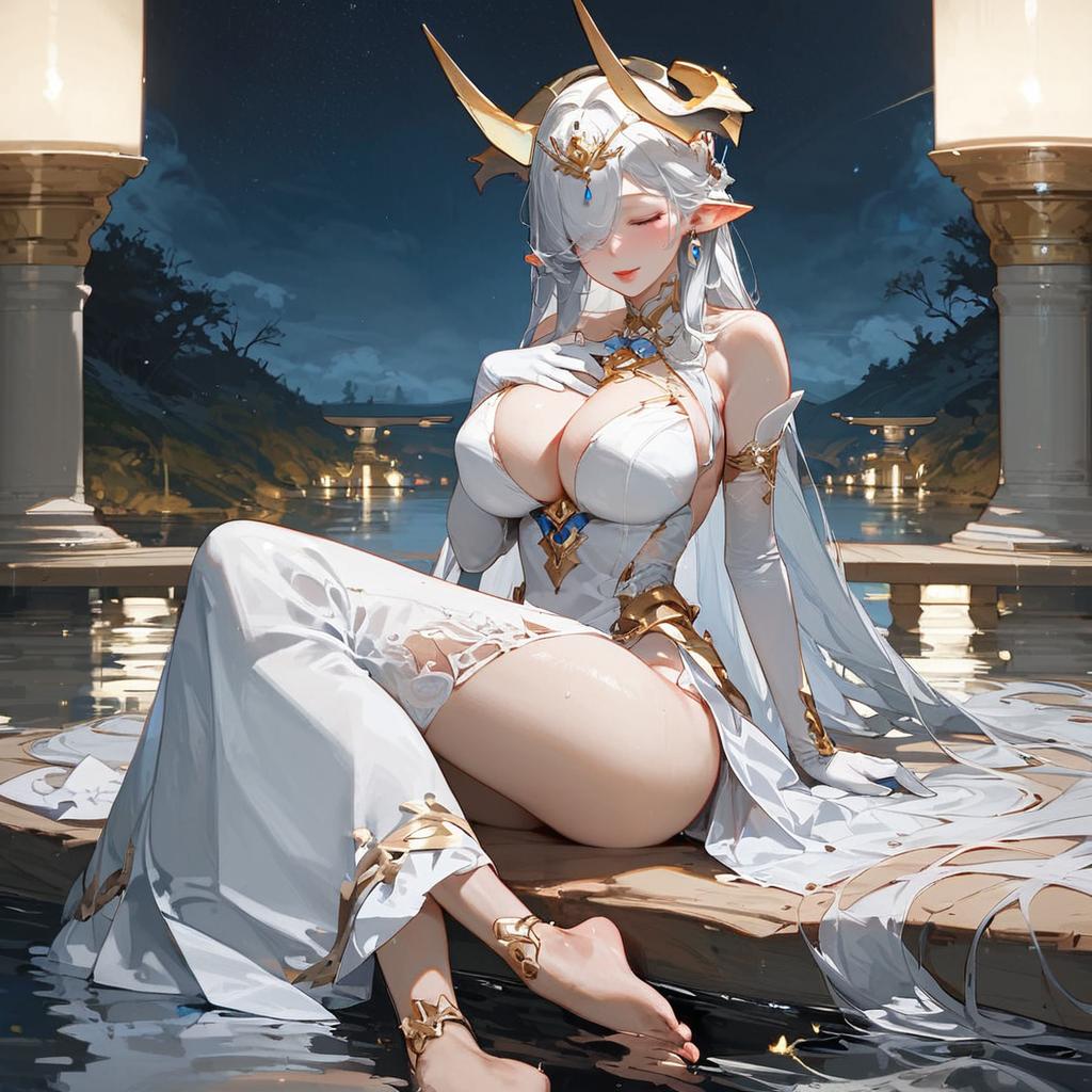 Score_9, score_8_up, source_anime, best quality, masterpiece, 4k, uncensored, prefect lighting, rating_explicit, very aesthetic, anime, 1girl, hair over one eye, gold tiara, gold horns, white dress, long dress, white elbow gloves, anklet, closed eyes, hand on own chest, night, lake, ripples on the water, large breasts