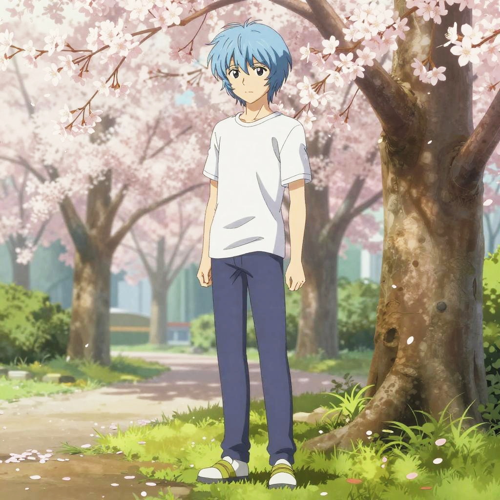 Rei Ayanami full body standing calmly in futuristic cityscape, soft pastel colors, detailed shading, anime style with sci-fi elements, serene expression, subtle lighting