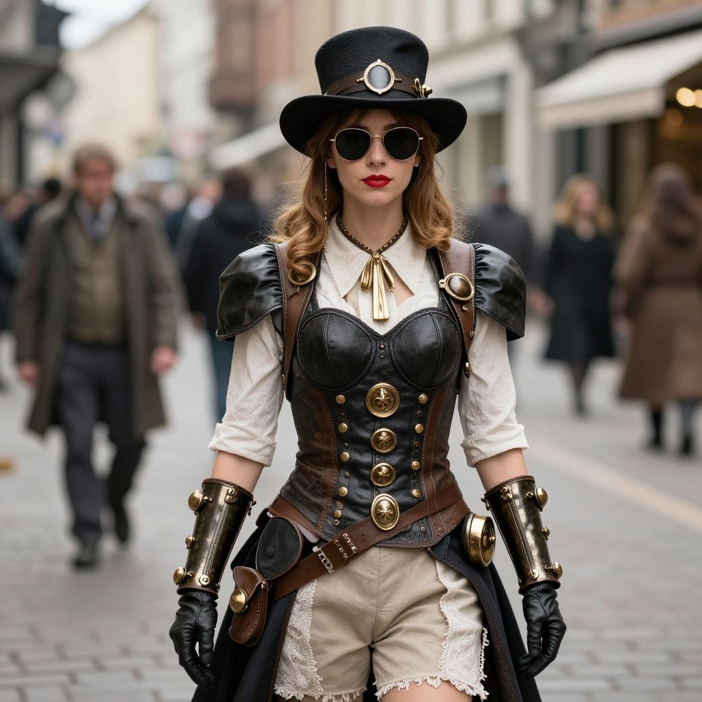 Steampunk woman in black hat, corset, white shirt, beige pants, brass armguards, gloves, and round sunglasses, standing confidently on