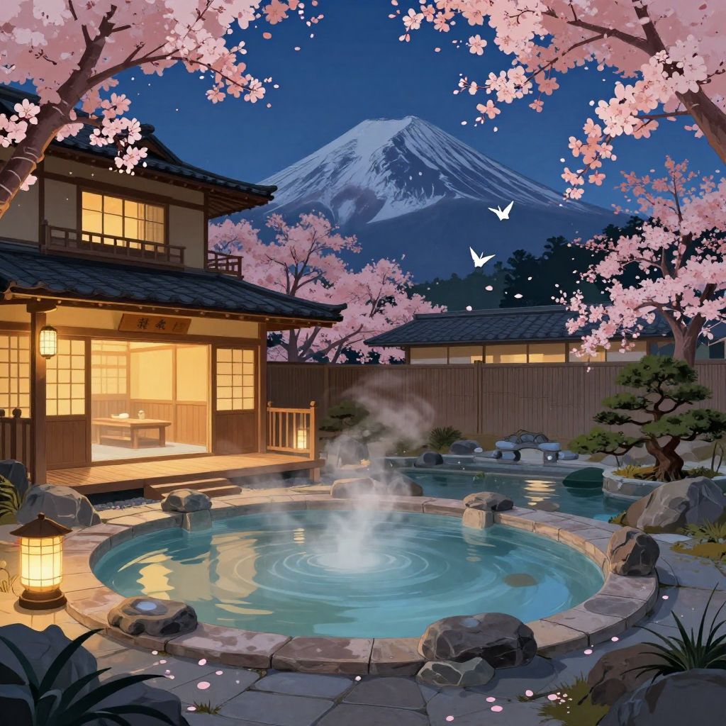 Anime hut nestled in a lush green forest clearing, warm glowing lanterns hanging outside, traditional Japanese architecture, serene and mystical atmosphere, sunset lighting