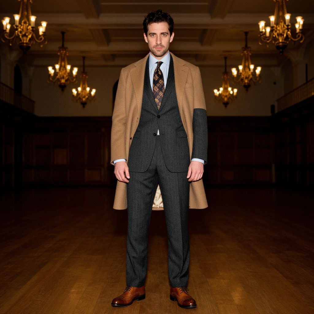 A man, charcoal gray pinstripe suit, light blue dress shirt, patterned silk tie, camel-colored wool overcoat, brown brogue shoes, historic ballroom, ornate chandeliers, rich wood paneling, eastman film stock, confident expression. Man has masculine face and piercing eyes